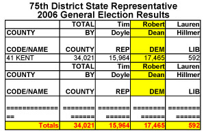With that in mind, this is the first in a series of looks at specific members of Dillon's tax hike caucus. The Democrats hold a 58-52 lead in the House. A shift of just four seats returns control to the Republicans, a caucus, for what it's worth, that held the line in impressive fashion against the Democrats' tax and spend gambit. According to Andy Dillon anyways. Four seats is more than doable. A move to a common sense approach that protects jobs and Michigan families is doable. Just a matter of getting rid of a few bad apples. And since I'm a Grand Rapids guy we're going to start close to home where only 1,500 some odd votes can make all the difference in the world. STATE REPRESENTATIVE ROBERT DEAN (D-GRAND RAPIDS)