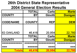 This is the nineteenth in a series of looks at specific members of Dillon's tax hike caucus. The Democrats hold a 58-52 lead in the House. A shift of just four seats returns control to the Republicans, a caucus, for what it's worth, that held the line in impressive fashion against the Democrats' tax and spend gambit. According to Andy Dillon anyways. Four seats is more than doable. A move to a common sense approach that protects jobs and Michigan families is doable. Just a matter of getting rid of a few bad apples. Today we venture into the heart of Oakland County where a second term lawmaker has built an impressive record of deceit after eeking out a narrow election win in 2004. STATE REPRESENTATIVE MARIE DONIGAN (D-ROYAL OAK)