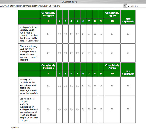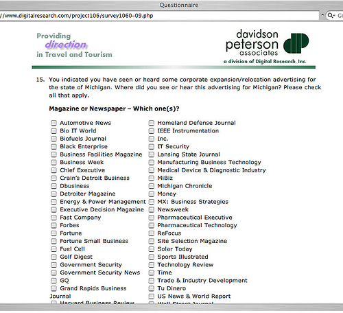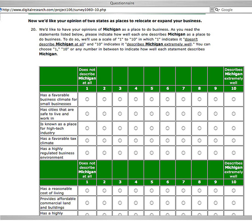In an appalling twist of irony, the governor has outsourced support jobs for the state's "Pure Michigan" campaign, a series of television and radio ads designed specifically to bring visitors and jobs to the Great Lakes State. It was early in her first term in office when Jennifer Granholm, with much fanfare, announced her executive order restricting purchasing and service acquisition to Michigan employers. The Michigan Republican Party in 2005 took her to task for purchasing pencils produced in China for the state lottery's popular Keno game. Her excuse then was that there weren't any Michigan companies producing "golf pencils." The State's purchasing director Sean Carlson told the Detroit News at the time that "no Michigan jobs were at stake." She hasn't got that excuse this time around and isn't practicing what she preaches. Kennebunk, Maine based Davidson-Peterson Associates has now been hired by the Granholm Administration's Michigan Economic Development Corporation and Travel Michigan to conduct online polling, research and analysis of the effectiveness of the regularly ridiculed ads featuring Jeff Daniels appealing to Michigan residents (and others) to visit Michigan. DPA, a division of Digital Research, Inc. conducts polling by providing incentives (frequent flyer miles and the like) to targeted internet users to answer online surveys. In other words, on top of the jobs outsourced by the administration they're actually underwriting and incentivizing each and every individual participant in the poll. (Screen caps below.) Further, their Michigan survey contains questions phrased in positive, affirming language and asks respondents to rank the truth of the statement on a scale of one to ten. Apparently it does not ask respondents to rank the truth of negative statements about the state or the ad campaign.