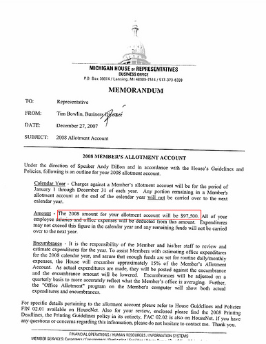 Some of the bills have sat idle in the House since they were introduced in March. On Monday, GOP lawmakers announced additional legislation and called for quick action on the entire package after the first of the year. Those calls have gone unanswered. The House Democrats have different priorities entering the new legislative year. While the Republicans fight tooth and nail with the Dem Speaker and his cronies to protect peoples' homes Andy Dillon has his sights set elsewhere... building a bigger bureaucracy! The memo below was delivered to House Republican offices between Christmas and New Years and comes directly from Dillon's business office. You'll notice a section outlined in red that announces each House Republican office will be granted $97,500 for staff and other expenses in 2008. That's a lot of cash in and of itself but the number becomes shocking when you take a look at the 2007 budget. Last year member offices only received $95,500.