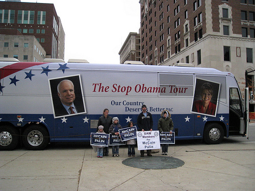 as it pulled up to the State Capitol but The Stop Obama Tour received a warm welcome from McCain/Palin supporters gathered there for the Stop Obama Rally.