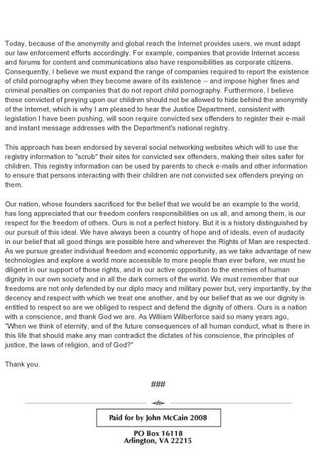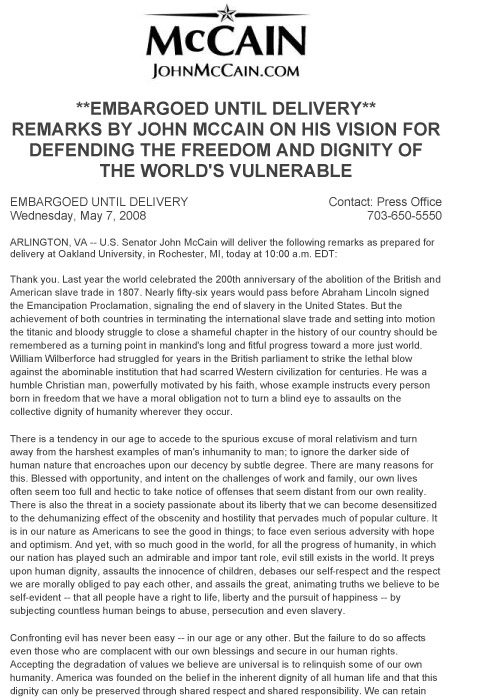 Oh, and because there isn't enough irony associated with the number of days and the potential end of the Clinton candidacy... the reinforcements have arrived. We've got no way of knowing how soon Obama might visit the Wolverine State. But we know that John McCain is here this morning delivering a speech and attending an open forum down in Oakland County. Go ahead and read on to check out the text of his speech...