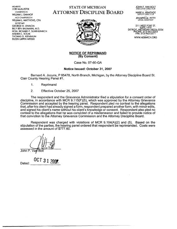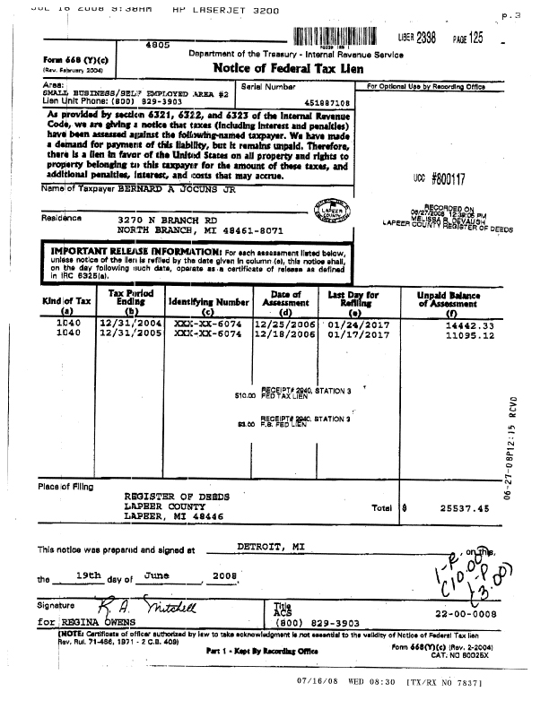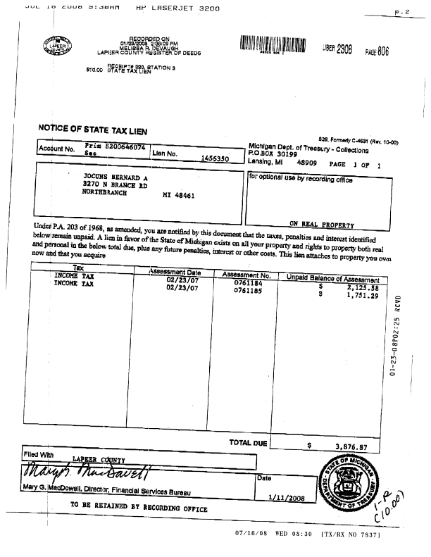 In other words, the man is the kind of defense attorney who gives other lawyers a really bad name. Forging signatures on legal documents? That's serious business. But hey, it's tough to get anywhere in Michigan Democrat politics without having your record stained by some sort of major ethical black mark. I'd say a criminal conviction fills that line on the MDP candidate application pretty well. But Jocuns story doesn't end there... it gets downright strange. After the Michigan Republican Party yesterday drew the state media's attention to his tiny little legal problem I'm told the man literally picked up the phone and called MRP demanding they tell his "side of the story." Not sure if that means he expects an MRP press release offering his excuses for his no contest plea or the questionable idea that he's really really sorry he's a criminal. Either way, the Party said they'd be happy to expand their discussion of Bernie's past and released new documents, tax liens from the Michigan Department of Treasury and the IRS showing that the big-time defense attorney has refused to pay nearly $30,000 in back taxes. Because nothing says "responsible enough to create tax policy" like a long-standing refusal to pay one's own tax bill.
