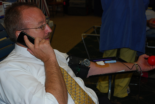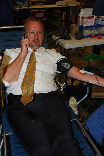 ![]() MRP Chairman Saul Anuzis conducts a radio interview while having his veins drained to help victims of Hurricane Gustav.