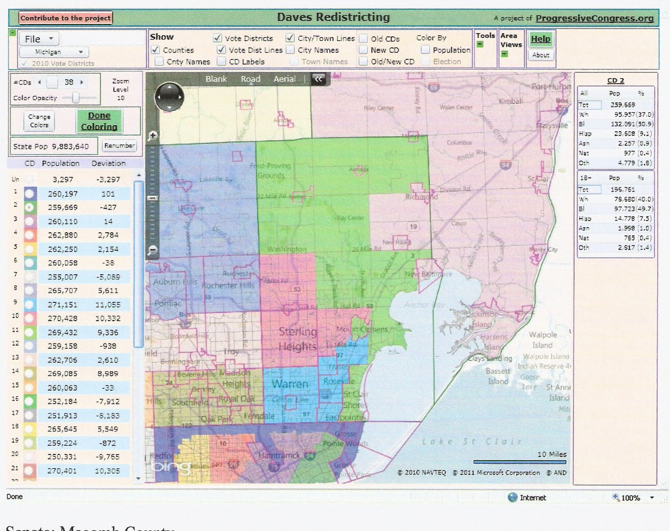 One major difference between the congressional and legislative standards is that populations for legislative districts are not required to be exact. They must be within 5% of the ideal population. For the Michigan Senate, the ideal population is 9983640/38=260095. The lower and upper thresholds are thus 247091 and 273100.