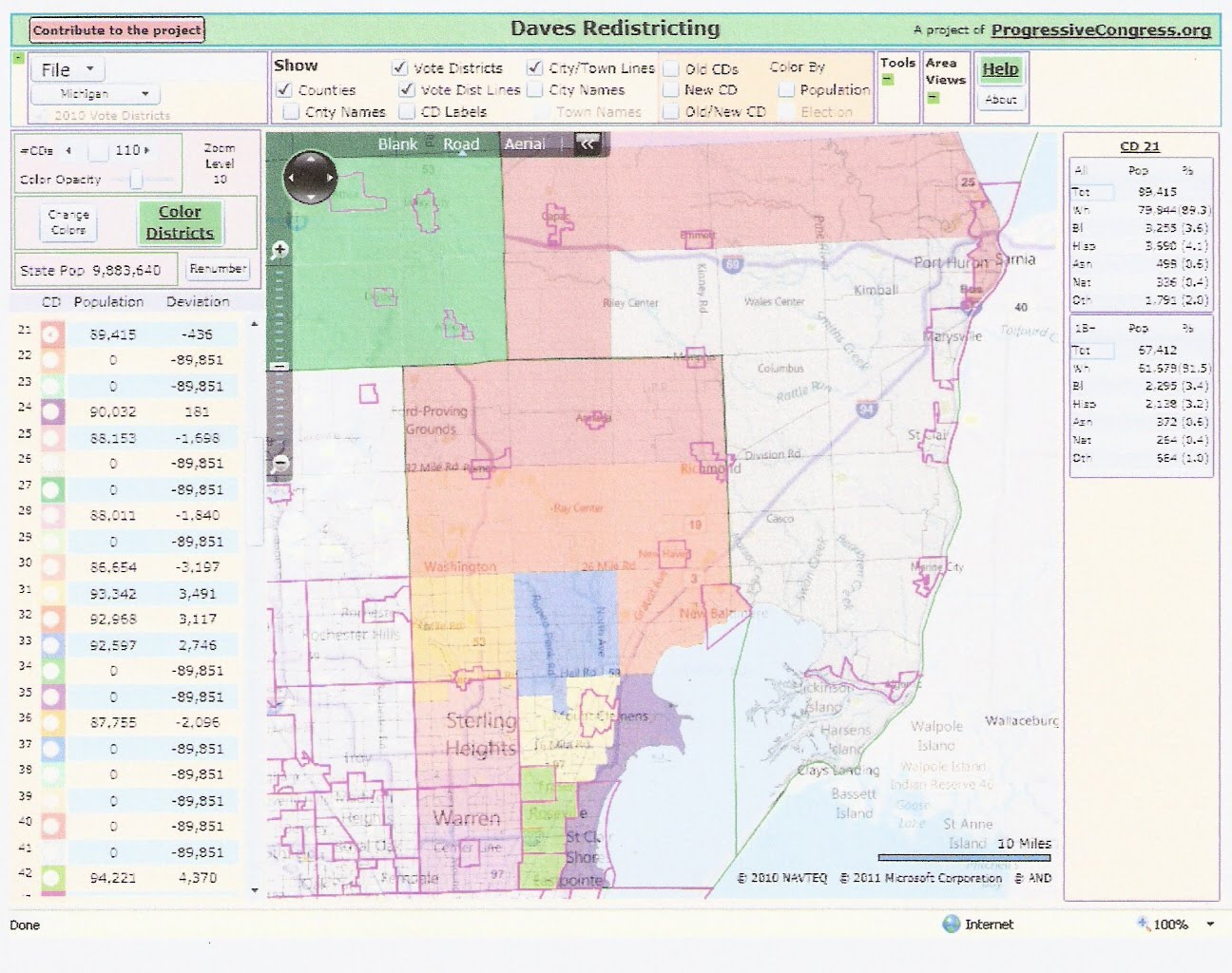 Another possibility is to share 11 districts between Macomb and St. Clair. This gives an average of 91274, which is still pretty far over. It also leads to a break in Tuscola. Instead, I opted to combine Macomb, St. Clair, Sanilac, and Huron into 12 districts for an average population of 90021. This avoids any county breaks in the Thumb. City and township breaks must also be considered. There must be breaks in Warren, Sterling Heights, and Clinton due to population. There also must be a break either in or around Shelby. I have not found a map with fewer than five breaks (counting double breaks). Currently Macomb has 5 Republicans and 4 democrats. St. Clair and Sanilac have two more Republicans. Three of the Republican districts (St. Clair Shores/Harrison, Chesterfield, Sanilac/Port Huron) were held by democrats before 2010. A reasonable goal for a new map is to strengthen (or at least not weaken) all the vulnerable Republican districts and add a new Republican district in the growing areas. The `new' district is squeezed in to contain Port Huron, the second-to-the-top tier of townships, and the top tier of Macomb County. No district with Port Huron is completely safe, but this district is likely to elect a Republican. The Chesterfield district is shoved over to Washington, which should make it safe. Here is the map. There are breaks in Warren, Sterling Heights (double) and Clinton (double).