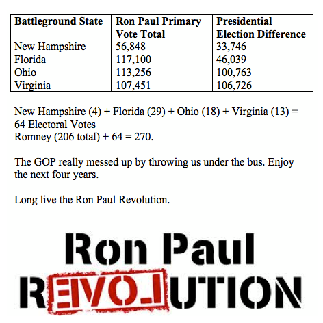 . . . I mean, honestly, wasn't this the same session in which the RNC earlier refused to seat the Maine delegation, because it included apparently too many Ron Paul delegates? And it wasn't even necessary. Only Santorum (6 states) and Paul (5 states) had delegate plurality support in enough states to rate a presence on the first convention ballot; Romney's first-ballot support was sufficiently overwhelming no matter what. Clearly, the establishment elites seemed to so believe that everyone who wasn't a hardcore Democrat would simply line up behind the nominee - because he's our only chance to beat Obama - that they didn't bother to concern themselves with any potential fallout from their "cereal bowl as urinal" treatment of any serious challenger to Mitt-flop's coronation. And therein lay perhaps their most serious overestimation of grassroots loyalty. See, it wasn't just Ron Paul whose campaign was undermined by the establishment kleptocracy. At various points during the primary process, they also crapped on the campaigns of Rick Perry, Newt Gingrich, and Rick Santorum . . . enough, I'm told, to permanently alienate about ten percent of each campaign's supporters in each and every state. Clearly, these idiots didn't really think through Reagan's Eleventh Commandment, else they'd have realized that "do no harm" has its limits. Forcibly tamping down dissent also calls to mind John F. Kennedy's admonition that those who make peaceful takeover impossible will ultimately make a revolt inevitable (and perhaps necessary), which I've been referencing regularly since September of 2010. Said revolt can take on many forms, including simply sitting out a critical election. And that brings us back to that four-state graphic. How plausible is the theory that Ron Paul support in four states would have been enough to swing the outcome of the 2012 Presidential Election? A key assumption of that theory is that Ron Paul's primary supporters universally took one of two protest actions in the general election: either (a) sat out the presidential election, or (b) voted "not republican," likely either via third party or writing in "Ron Paul" (the latter of which I'm told happened in unprecedented numbers nationwide). Unless you're prepared to interview the 395,040 Ron Paul primary voters in those four states, assuming that you could accurately track them down and that they would answer you honestly if you did, there's no way to actually verify this assumption. But for argument's sake, let's just go ahead and call it a given. The next step, of course, is to verify the general election vote totals for the states in question, as well as Ron Paul's primary vote totals in the same states. (We have to verify the accuracy of the source information, after all.) I also expanded the "search" a tad. Using the Colorado University model that I discussed about six weeks ago as my reference point, I went back and reviewed the totals for each of the seven states that the model projected would go Obama, but by well under five points, as well as the ten states that the model projected to go for Romney, but that went POTUS blue instead. Necessarily, this included the four states in question. Where possible, I verified the information with the respective state election authority; where not, I used The Green Papers as source information (and I'm sure that Tony Roza will appreciate the shout-out). The end result is an overview of how many of a potential 194 electoral votes could have theoretically been flipped into Romney's column by the support of Ron Paul's primary voters. As the chart at this link makes clear, the basic theory is plausible for only three states: Florida, New Hampshire, and Ohio; not so much for the remaining fourteen (though Virginia is tantalizingly close), which still leaves Romney 13 electoral votes short. However, a slightly deeper analysis notes that the combined support of Rick Santorum, Newt Gingrich, and Rick Perry (assuming that enough of them took the same protest actions in the general election as the Ron Paul supporters), could have combined with the Paul supporters to flip the outcome in Michigan, Pennsylvania, and Wisconsin (and reduce Obama's margin in Iowa to a mere 7,335 votes). Unfortunately, we're never going to know for sure how much support Gingrich and Perry had in Virginia, because the state party changed the signature verification rules mere weeks before the filing deadline for the Virginia primary. Ultimately, of course, we are never going to know empirically how much support the Republican Party alienated in 17 key states, ten of which Romney should have won, all of which he could have won, and at least four of which he needed to win. The "scorched earth" approach to the primary process, risking alienating critical grassroots support in key states, was but one factor among many that combined to cost the Republican Party big nearly three full weeks ago. That having been said, anyone who's at all familiar with Ron Paul's supporters knows that his primary voters tend to also be motivated grassroots volunteers. And in 17 key states, I'm thinking that a total of about 875,887 motivated neighborhood canvassers would have been really handy. So whose bright idea was it to treat them like they didn't matter?