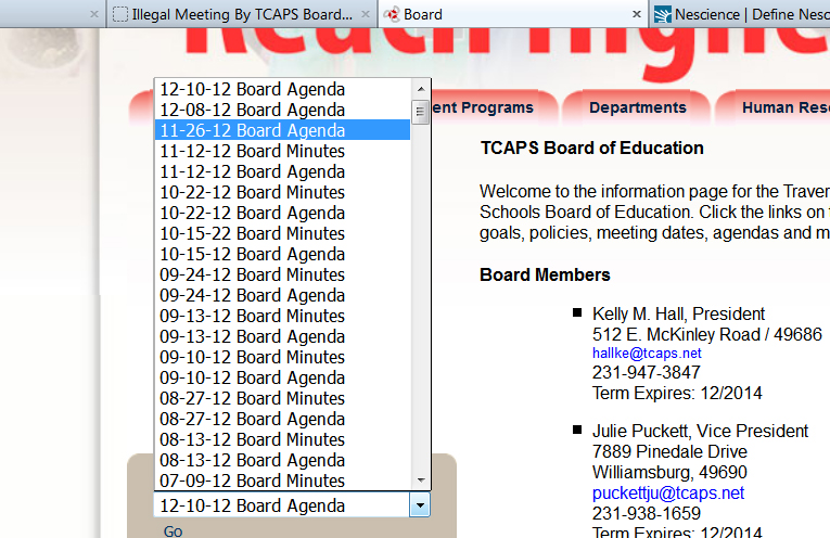 Yesterday, there was a meeting that was held that I suggest is in violation of the OMA. I have posted upon it here. The video is somewhat self explanatory, with my request to the board that they adjourn the meeting until the meeting date that was scheduled on their website (the 14th of December) until 5 minutes after I and my associate had left. They did not adjourn and continued on despite the advice offered and the information about the improper meeting posting on the website.