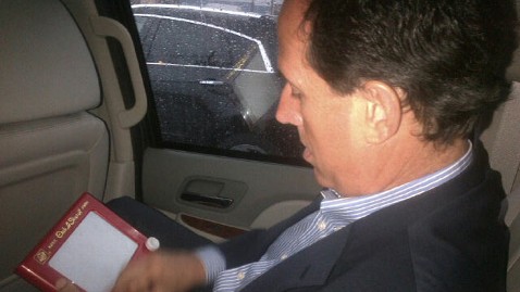 And both Santorum and Gingrich have been showing up at campaign events in Louisiana with Etch-A-Sketches in hand (handy little props, they are). Santorum was also photographed in his car studying up on Romney's policy positions: