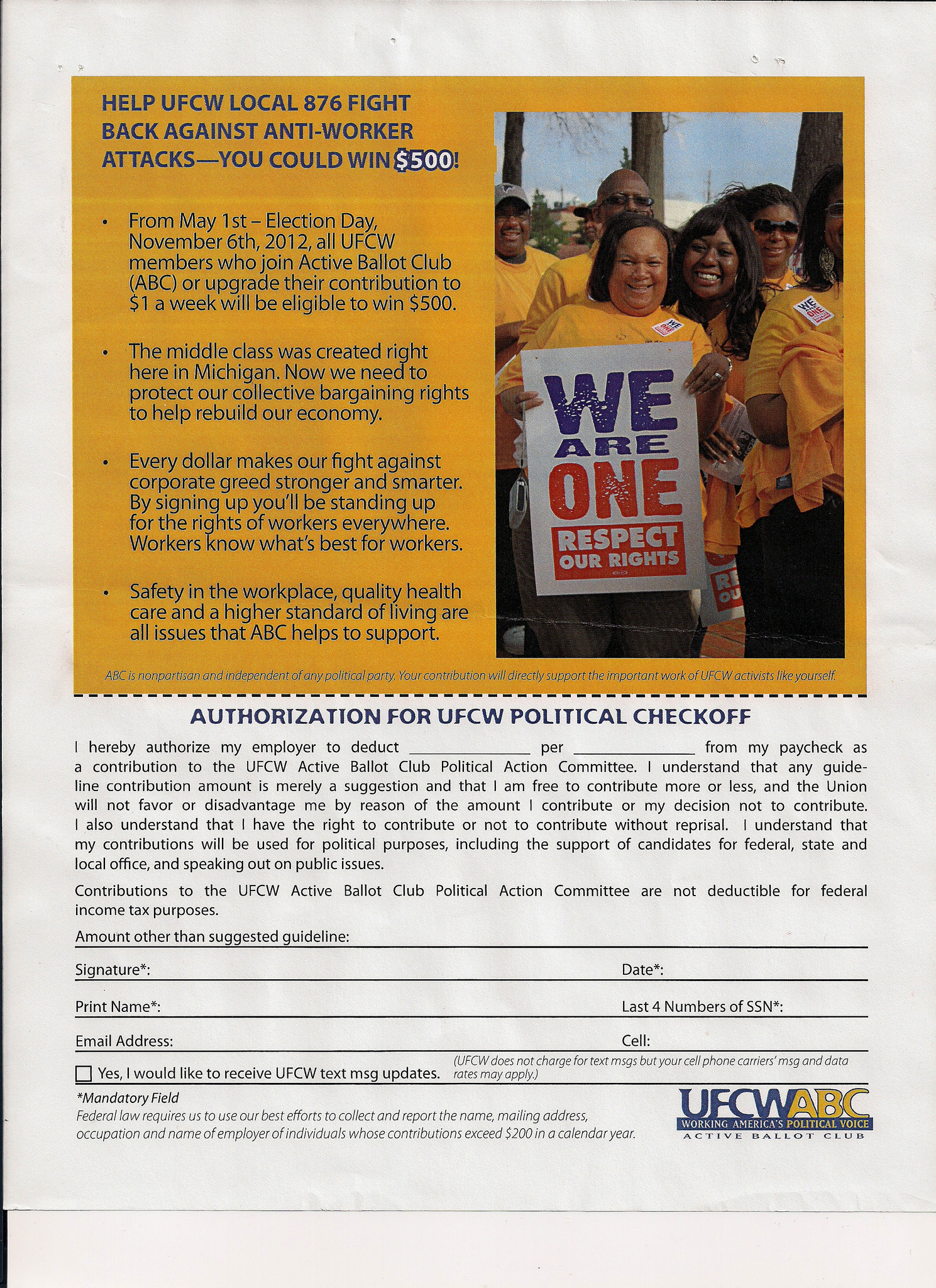 I'm not complaining, mind you. It pays the bills, and I get an opportunity to see a lot of things around the country. Some of that is impressive. Seeing the sun reflecting off of the St. Louis Arch from I-70 near dawn. Driving over the Mackinac Bridge in the middle of the afternoon and admiring the view on a clear sunny day. Taking in the view from my "office window" of the Appalachians while driving down I-26. Some of it is sad. Anytime I drive the surface streets around Detroit. Driving through the ghost town that once was Wilmington. Anything in Gary, IN. And some of that just makes you sit back and shake your head. I also go to pick up and drop off at a lot of companies and businesses where I also do a lot of the above. However, I came across this flyer in the driver's room at a DC for the UFCW which really caught my attention. I'm not going to shock you about whom the unions are supporting, what issues they are backing, and what they think of AG Schuette this week. No, this one has to do with raising funds for their political machine. Time for a little backstory: One of the things labor unions complain about is that there is more attention being paid to where member dues are actually going and that they can no longer automatically shake down members to fill the coffers for {fill-in-the-name-of favored-candidate/cause}. Much like the Teamster's D.R.I.V.E. Fund PAC or the UAW's C.A.P. PAC, the UFCW has a similar entity called A.B.C. ("Active Ballot Club"). Now, why A.B.C. feels that "Don't ask, don't tell" has anything to do with labor issues is beyond me, but I digress. Unions now resort to these operations, and need to ask their members first before taking their money to generate cash for democrats and progressive causes. Generally speaking, these PAC's are year-round operations, but are mostly active in the months leading up to elections. They typically ask members to fill out and sign a form or card and then money is automatically deducted from their paycheck at a set pay interval. As a rule, they do not ask members if they wish to renew every year. It's up to individual members to cease donating if they feel they are not getting their money's worth. Interesting note: For those members who no longer feel that their political donations are put to the best use, the process for ending this donation is purposefully made difficult and cumbersome by unions. But, to be fair, members can opt out if they want to. Even though unions aren't very keen to what's happening with democrats on the National Level as demonstrated over the fallout with next weeks DNC Convention, they do need cash to push for things they care about closer to home like the "Protect Our Jobs" Amendment, "Home Health Care" Amendment (a.k.a. SEIU's Stealth Union attempt pt. 2) Amendment and the Emergency Manager Amendment. Hmmmmm hmmm hmmm ummm um! Unions need cash to give to democrats and fund their other political causes. What to do? How about hold a lottery? A lottery to raise money??? Don't take my word on this. Read it for yourself.