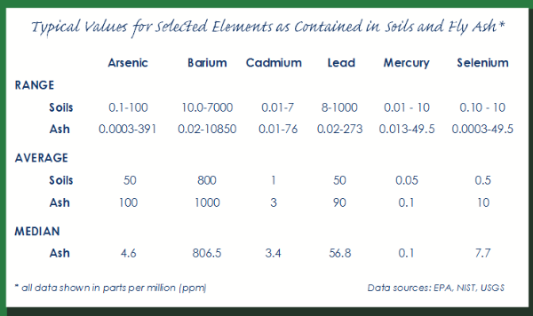 Yet the presumed danger of coal ash in the great lakes is not necessarily partisan either. The drive to destroy coal by the president and his administration overrides previously established EPA standards and accepted levels of heavy metals and mercury. It was in 1993 that the Clinton administration EPA that found coal ash and other fossil waste non hazardous. Saying in August of that year, that "Based on all of the available information, EPA has concluded that regulation of the four large-volume fossil-fuel combustion wastes as hazardous waste under RCRA Subtitle C is unwarranted" And in May of 2000 "In today's action, we are determining that regulation of fossil fuel combustion (FFC) wastes under Subtitle C of the Resource Conservation and Recovery Act (RCRA) is not warranted." And in fact, he ground we walk on could be higher in heavy metals. The chart below demonstrates the range in either material. Presumably the coal used, will affect the outcomes of the ash. And the calculated mercury effect to the lake by the SS Badger over an entire season is less than an ounce.