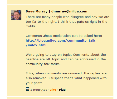 Especially when its used in the face of an article that begins with a lie The title "'Filthy homosexuals': Michigan GOP leader Dave Agema's Facebook post sparks furor " SCREAMS out to the casual reader that MI Committeeman Dave Agema made such a statement. I was amazed he would say such a thing. Amazed I tell ya! Funny.. he never did. He quoted someone who actually said: "Part of the homosexual agenda is to get the public to affirm their filthy lifestyle, as one homosexual admitted in the October 1987 homosexual rally on Washington: "We are no longer seeking just a right to privacy and a protection from wrong. We also have a right -- as heterosexual Americans already have -- to see government and society affirm our lives"Huh.. so very different. Yet when challenged, instead of acknowledging the error in reporting, the editorial board for MLIVE simply deletes comments they do not like. I can understand that on someone's personal blog, but this entity presents itself as a news source. Editor Dave Murrays says: "Readers,Yeah ok Dave. lets take a look at what got MY comments ALL Deleted. Go below the fold.