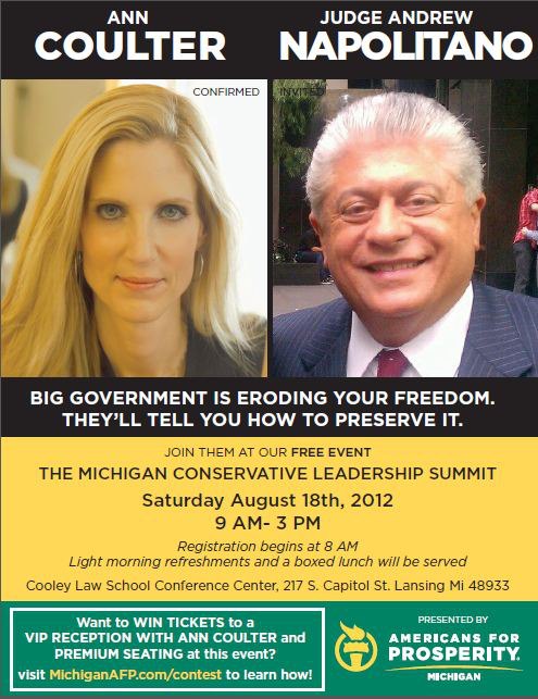 Americans for Prosperity brought Andrew Breitbart, Michelle Malkin, and Ann McIlhenny to Traverse city for an all day event. Also included was Hillsdale Economist Gary Wolfram, CEI's Vincent Vernuccio, and others.