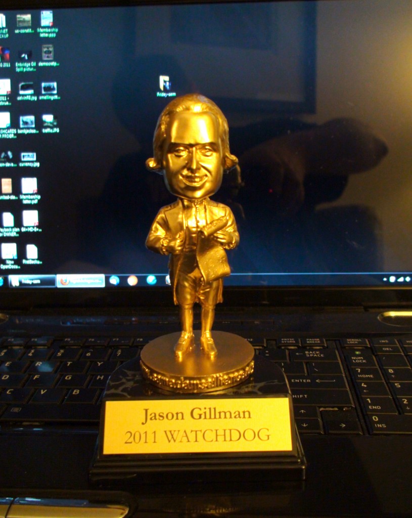 I was a finalist, then won, and split the prize with Chetly Zarko for the watchdog award at the Sam Adams Alliance event as mentioned previously. The other two finalists Rob Port of Minot ND, and Sherry Loar of Petoskey were both worthy of this award, so its with a greater sense of humility that I accepted it. Its really a big deal. Rob runs a watchdog type blog which is like a combination of the Blog Prof's site, and RightMichigan.com. Sherry took the lead as the plaintiff fighting the forced unionization scam, who sacrificed both monetarily and psychologically in dealing with the collusive measure brought about by the last administration and their union cronies. I was in very respect worthy company. I should note that I am not the greatest speaker, and I do not travel with dueling teleprompters. So this award might well be seen as the greatest speaking fee I should ever expect to see. I guess that is OK, as long as I can keep the pen to the page (so to speak) to entertain and inform. The video with Eric Rothoff and myself during the acceptance is below the line. (1 comment, 293 words in story) Full Story By JGillman, Section News