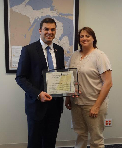 Grand Rapids, MI - Congressman Justin Amash R-3rd US Congressional District, on Wednesday received the Constitution Defender award from the Constitution Celebration Committee. Presenting the award was Heather Cerone, Jody Ferry, and Candy Gillman (shown here with Representative Amash)