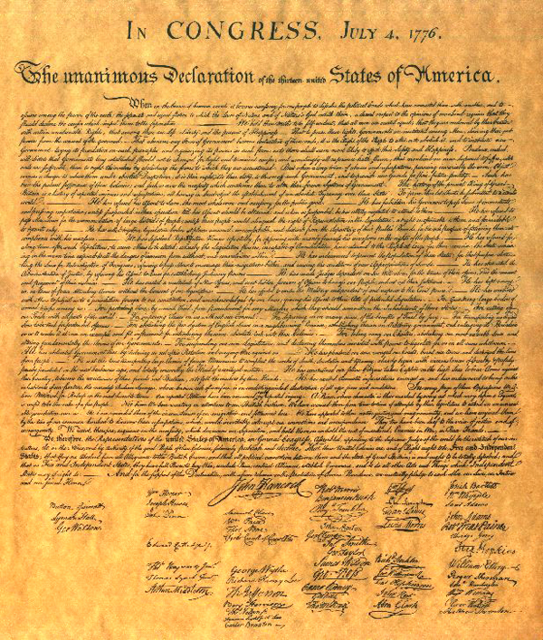 IN CONGRESS, July 4, 1776.The unanimous Declaration of the thirteen united States of America, When in the Course of human events, it becomes necessary for one people to dissolve the political bands which have connected them with another, and to assume among the powers of the earth, the separate and equal station to which the Laws of Nature and of Nature's God entitle them, a decent respect to the opinions of mankind requires that they should declare the causes which impel them to the separation. We hold these truths to be self-evident, that all men are created equal, that they are endowed by their Creator with certain unalienable Rights, that among these are Life, Liberty and the pursuit of Happiness.--That to secure these rights, Governments are instituted among Men, deriving their just powers from the consent of the governed, --That whenever any Form of Government becomes destructive of these ends, it is the Right of the People to alter or to abolish it, and to institute new Government, laying its foundation on such principles and organizing its powers in such form, as to them shall seem most likely to effect their Safety and Happiness. Prudence, indeed, will dictate that Governments long established should not be changed for light and transient causes; and accordingly all experience hath shewn, that mankind are more disposed to suffer, while evils are sufferable, than to right themselves by abolishing the forms to which they are accustomed. But when a long train of abuses and usurpations, pursuing invariably the same Object evinces a design to reduce them under absolute Despotism, it is their right, it is their duty, to throw off such Government, and to provide new Guards for their future security.--Such has been the patient sufferance of these Colonies; and such is now the necessity which constrains them to alter their former Systems of Government. The history of the present King of Great Britain is a history of repeated injuries and usurpations, all having in direct object the establishment of an absolute Tyranny over these States. To prove this, let Facts be submitted to a candid world. (the remainder below with appropriate emphasis added.) (1702 words in story) Full Story By JGillman, Section News